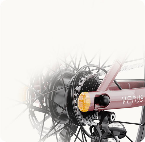 Venus comes with hydraulic disc brakes to help riders stop safely, timely, and confidently. It also comes with a bright headlight and integrated turn signals to help you see and be seen in traffic.