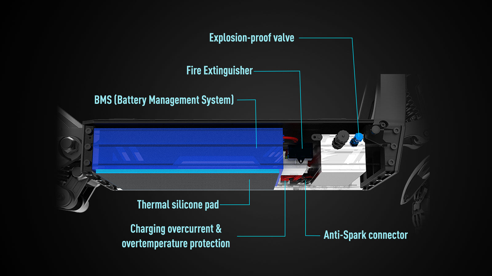 6. Fire Extinguisher: Integrated into the battery compartment, the fire extinguisher releases fire-suppressing gas when temperatures rise, ensuring maximum safety for riders of this electric scooter 70mph.