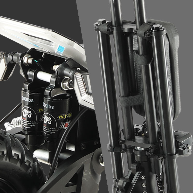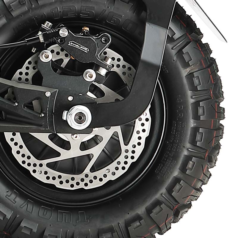 The dual hydraulic suspension in the front and dual shock absorbers in the rear provide excellent ride comfort. This system efficiently absorbs shocks and bumps, delivering smooth handling and stability across different terrains, whether on city streets or rougher off-road paths.