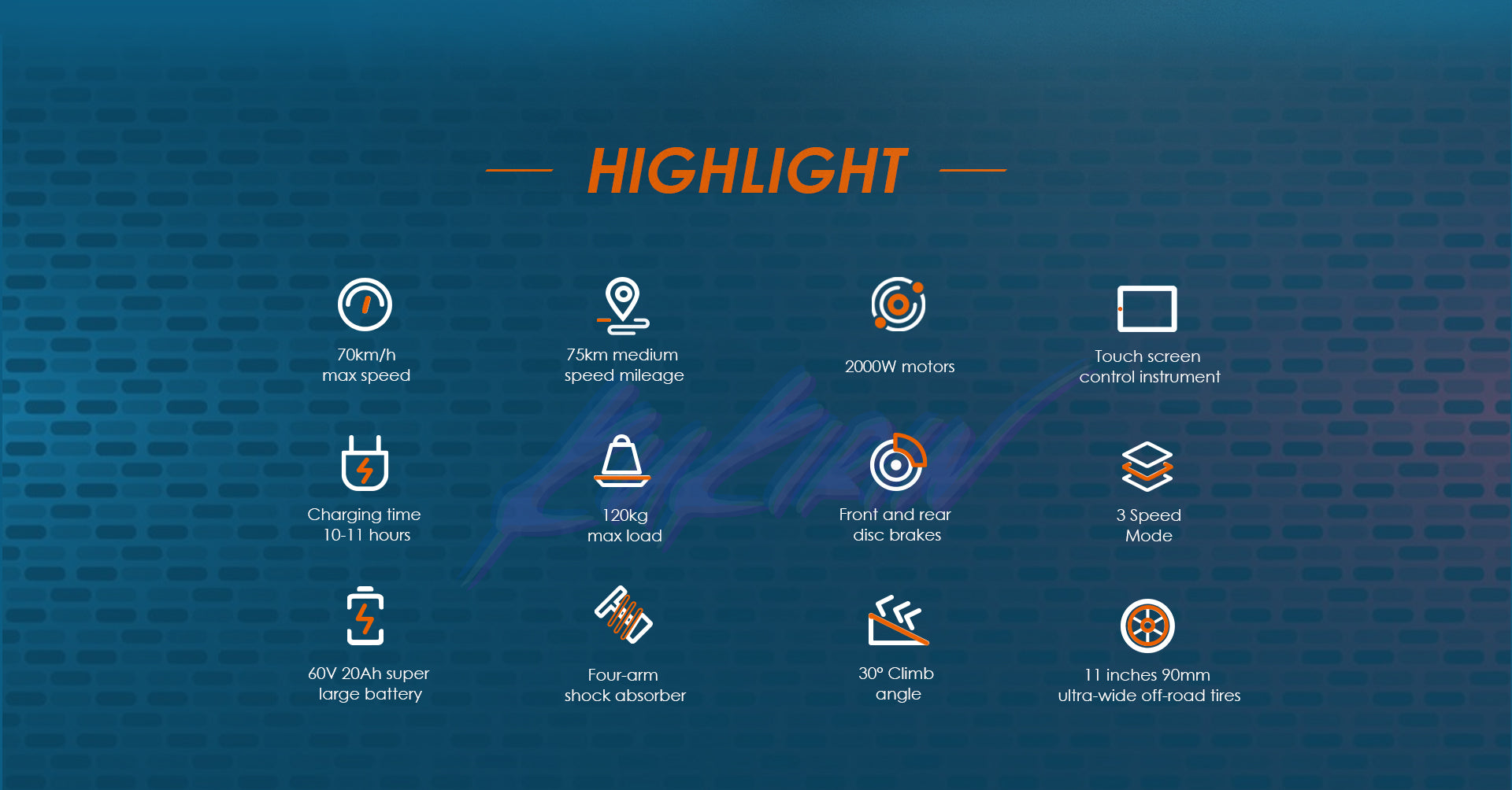 20Ah/1200Wh high-capacity high-performance, high-quality lithium with a maximum battery life of 75KM.While continuously outputting high rate current, it can also provide you with ultra-long battery life guarantee.