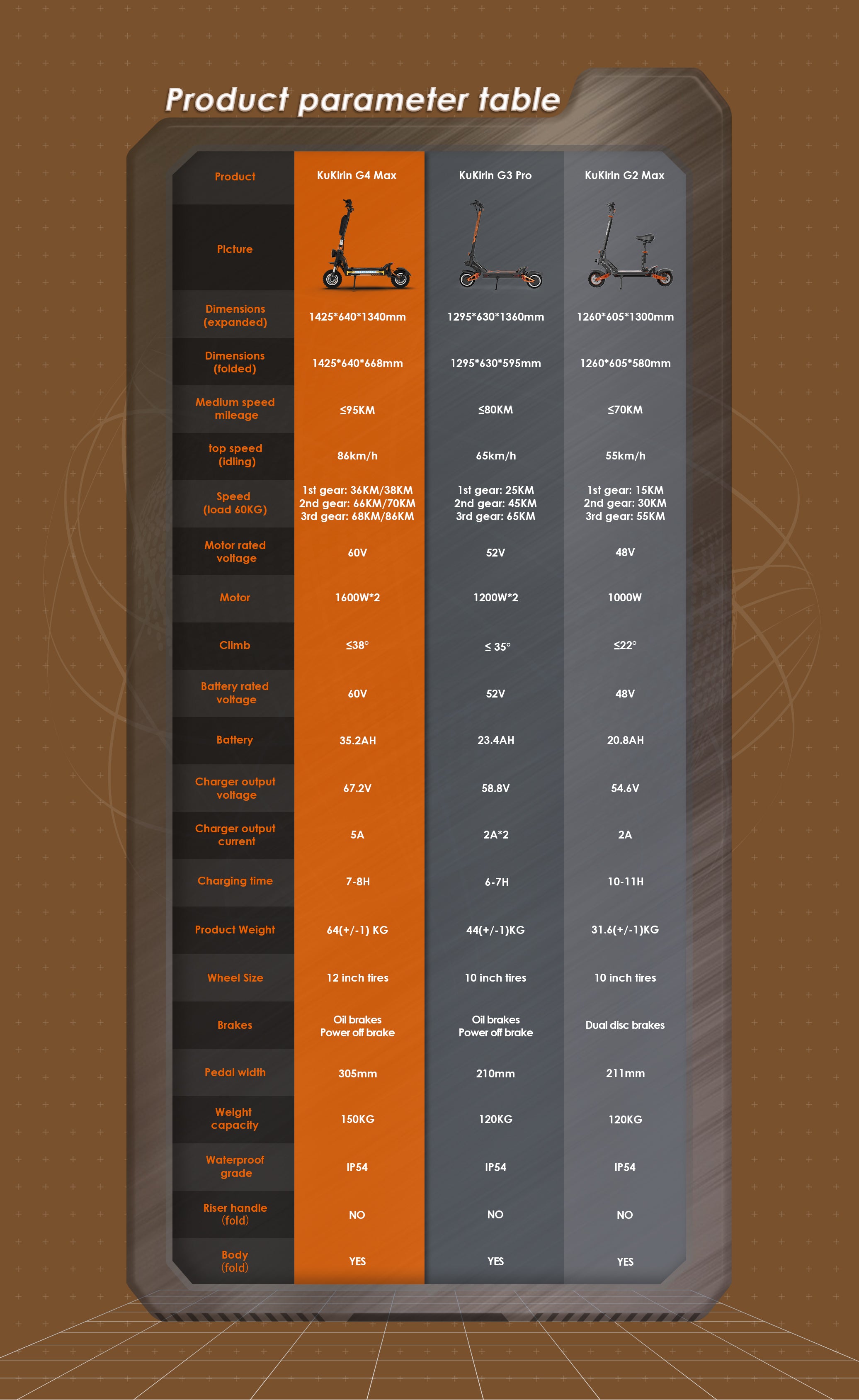 KuKirin G4 Max stud adopts hollow shape design, which retaining the original section division, compact and simple bodycompact,showing speed and strength. It pursues high appearance while achieving better wind breaking results, pushing the speed and power aesthetics of high-power electric scooters to a new level.