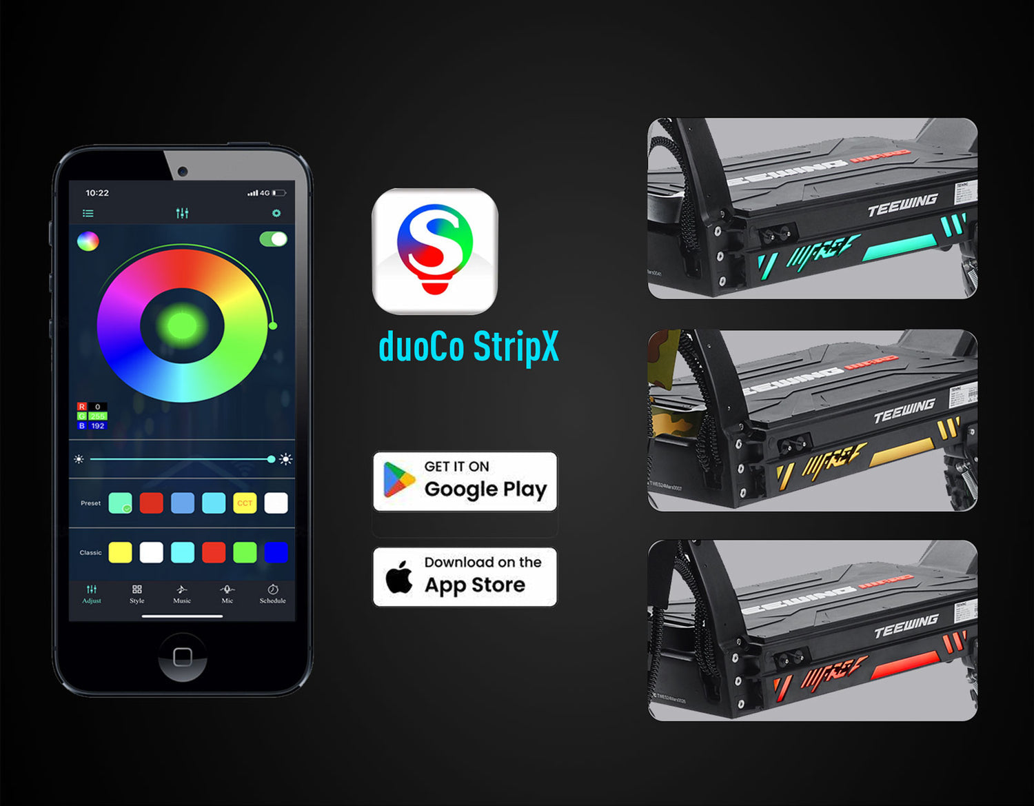 Elevate the aesthetics of your dual motor electric scooter with the duoCo StripX app. This innovative feature lets you control the color of your scooter's footboard edge lights, allowing you to customize them to any shade you desire.